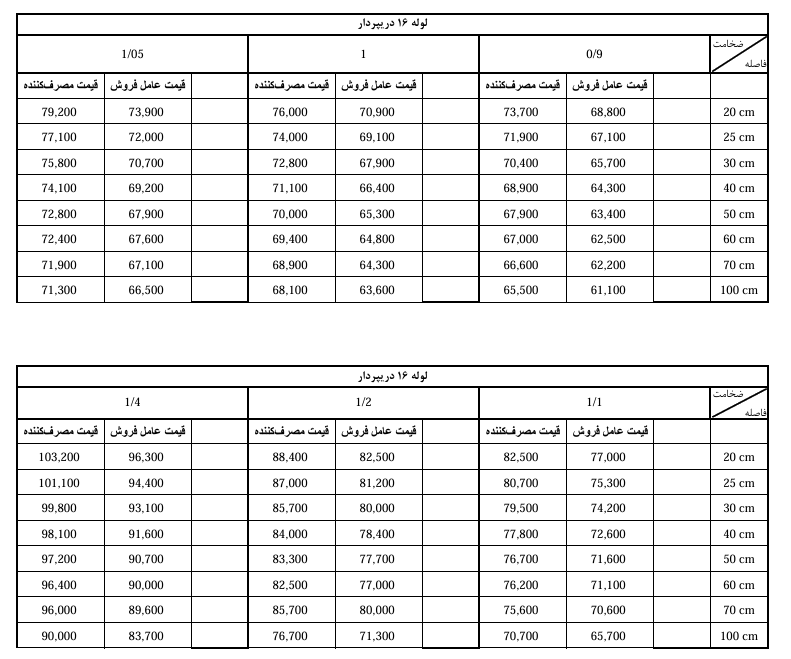 قیمت لوله قطره چکاندار بر اساس وزن لوله، ضخامت آن و مواد اولیه به کار رفته در تولید آن محاسبه میشود. قاعدتا هر چقدر ضخامت لوله بیشتر باشد، وزن آن نیز بالاتر میرود. عامل دیگری که در قیمت لوله دریپردار تاثیر دارد، فواصل قطره چکان ها است. قاعدتا هر چقدر فواصل بین قطره چکان ها کمتر باشد، تعداد بیشتری قطره چکان درون لوله به کار رفته و قیمت آن افزایش مییابد. لوله دریپردار در دو ضخامت 1/2 و 1/4 اینچ تولید و عرضه میشود. برای اطلاع از جدیدترین قیمت لوله دریپردار با واحد فروش بازار کشاورزی تماس بگیرید.