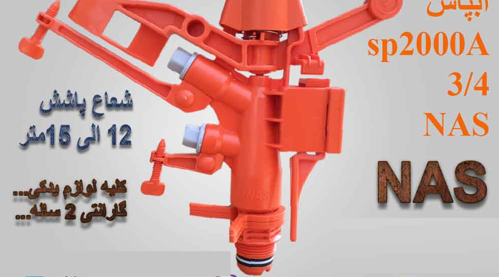 آبپاش تنظیمی NAS سایز ۲۰۰۰ (۳/۴ اینچ) مناسب برای آبیاری کنترلشده با شعاع پاشش ۱۲ تا ۱۵ متر. قابلیت تنظیم زاویه پاشش، مقاوم در برابر باد، نصب آسان و دوام بالا.