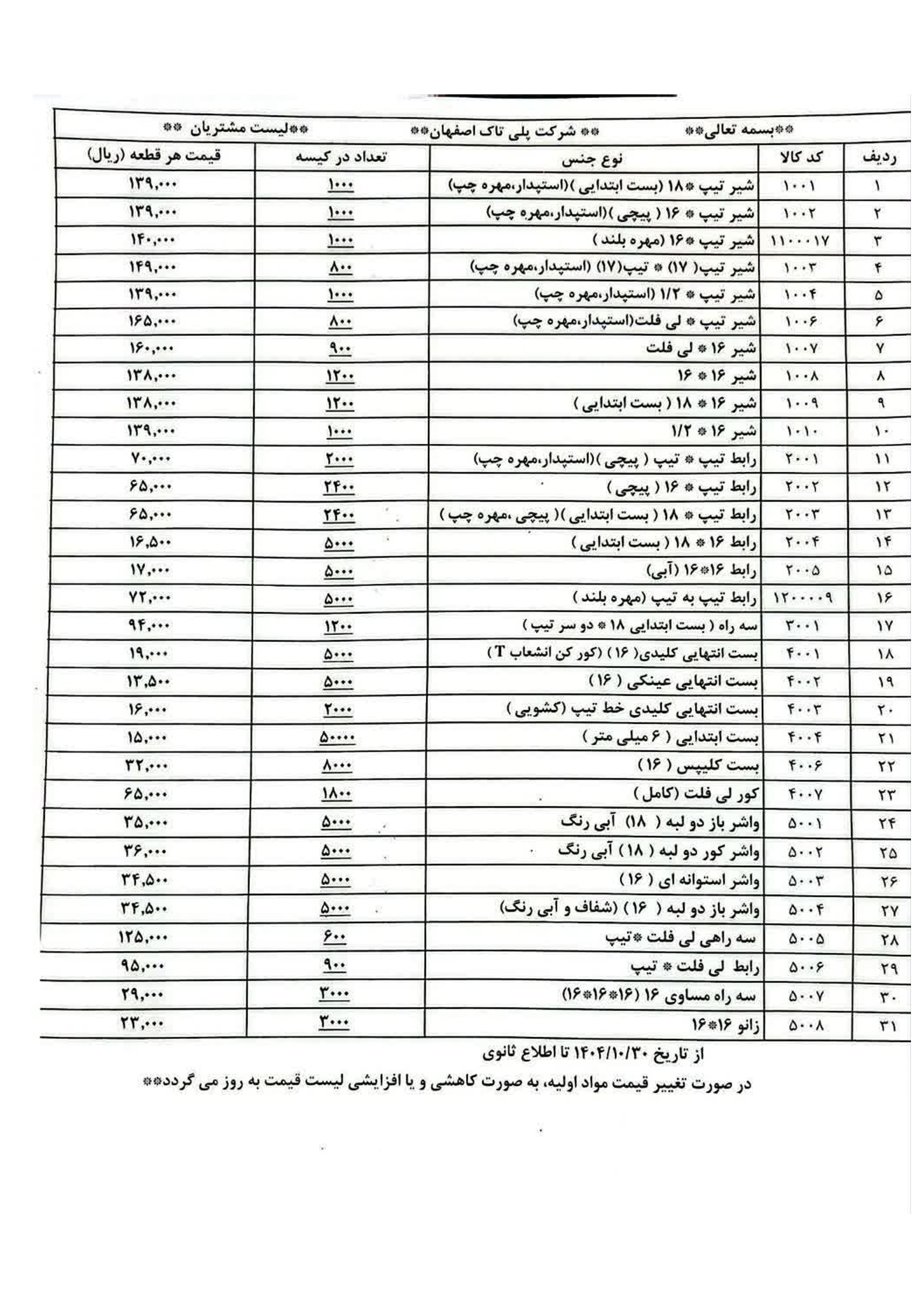 لیست قیمت محصولات شیرآلات صنعتی شیرود (بهمن 1404)