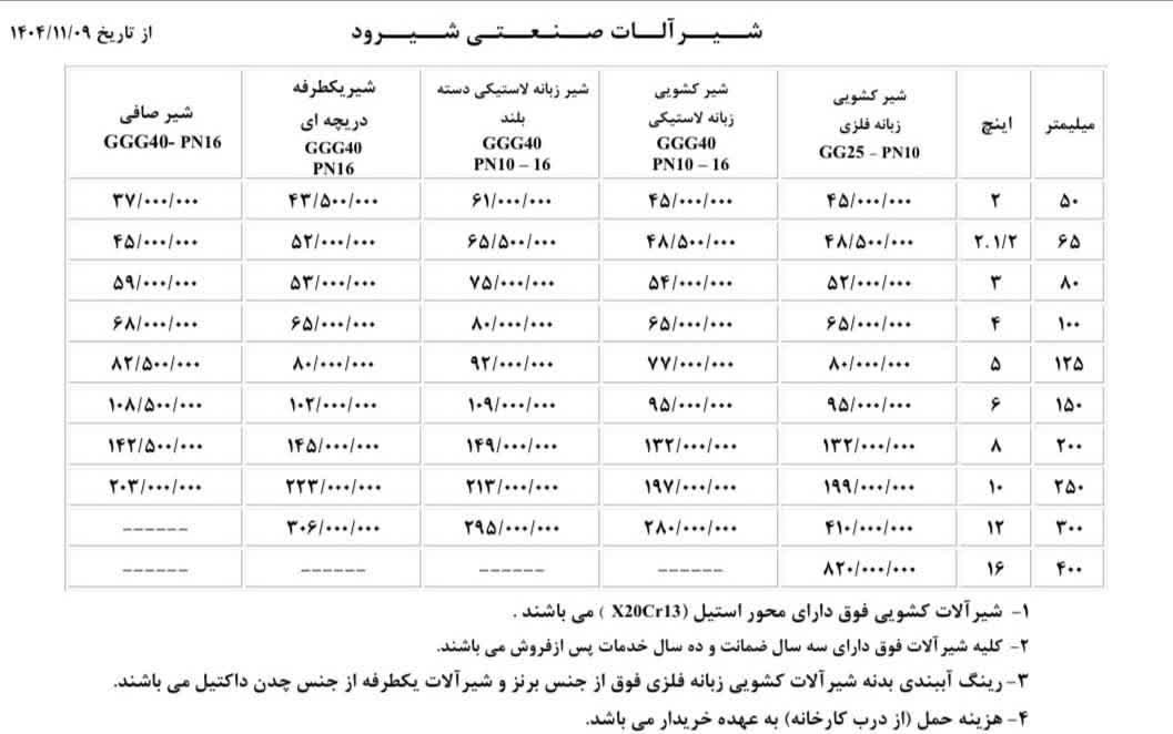 لیست قیمت محصولات شیرآلات صنعتی شیرود (بهمن 1404)