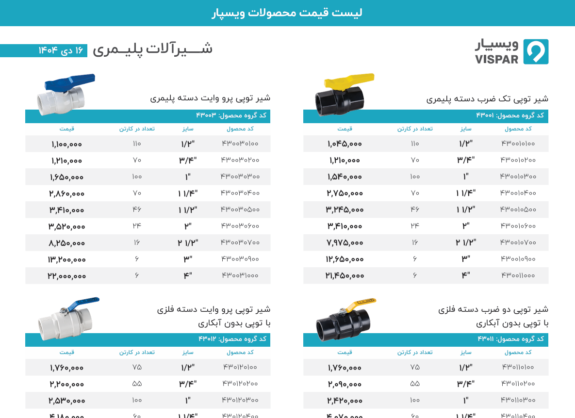 لیست قیمت محصولات ویسپار (دی 1404)